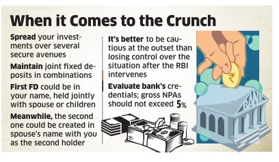 “Banks’ administrative board can approach the RBI with a plea for relaxing the withdrawal limits in case of accountholders such as those who have saved or deposited money for their medical treatment or educational purpose and pensioners,“ says VN Kulkarni, chief credit counsellor with the Bank of India-backed Abhay Credit Counselling Centre. Spread Your Risks Since one cannot do much after the bank gets into trouble or the RBI comes into the picture, it would be wise to take some precautions. “Depositors need to be selective not only in choosing the bank, but also in depositing the amount using different combinations,“ says Kulkarni.
